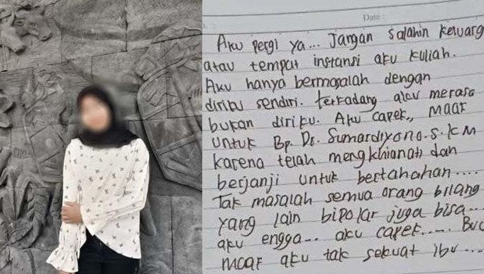 "Maaf untuk Bapak Dr. Sumardiyono, S.Km karena telah menghianati dan berjanji untuk bertahan. Tak masalah semua orang bilang yang lain bipolar juga bisa, aku nggak... Aku capek, Bu. Maaf aku tak sekuat ibu," tutupnya.